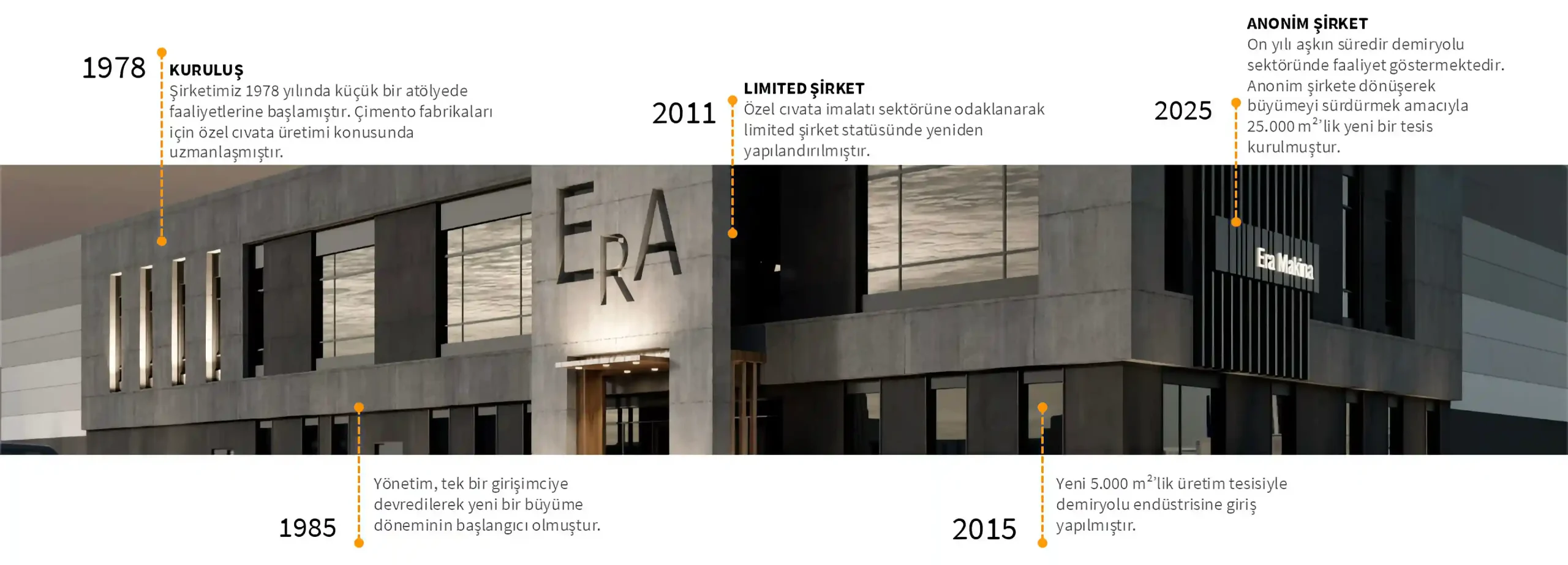 ERA Özel Cıvata ve Mak. A.Ş. 1978 yılında Makine Mühendisi Eşref Celal Katipoğlu tarafından kurulmuştur. Firma, faaliyetlerine çimento sanayine yönelik özel cıvata ve yedek parça üretimi ile başlamış, zaman içerisinde edindiği mühendislik tecrübesi ve üretim altyapısı sayesinde farklı sanayi kollarında önemli projelere imza atmıştır.